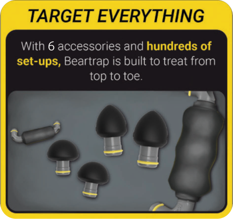 • The Beartrap is a versatile, all in one treatment device designed to target and relieve pain throughout the entire body. Beartrap is designed to target multiple muscle groups, including the neck, jaw, shoulders, arms, chest and legs. The interchangeable components allow you to customize it for different treatments.